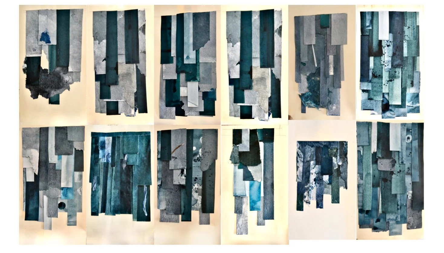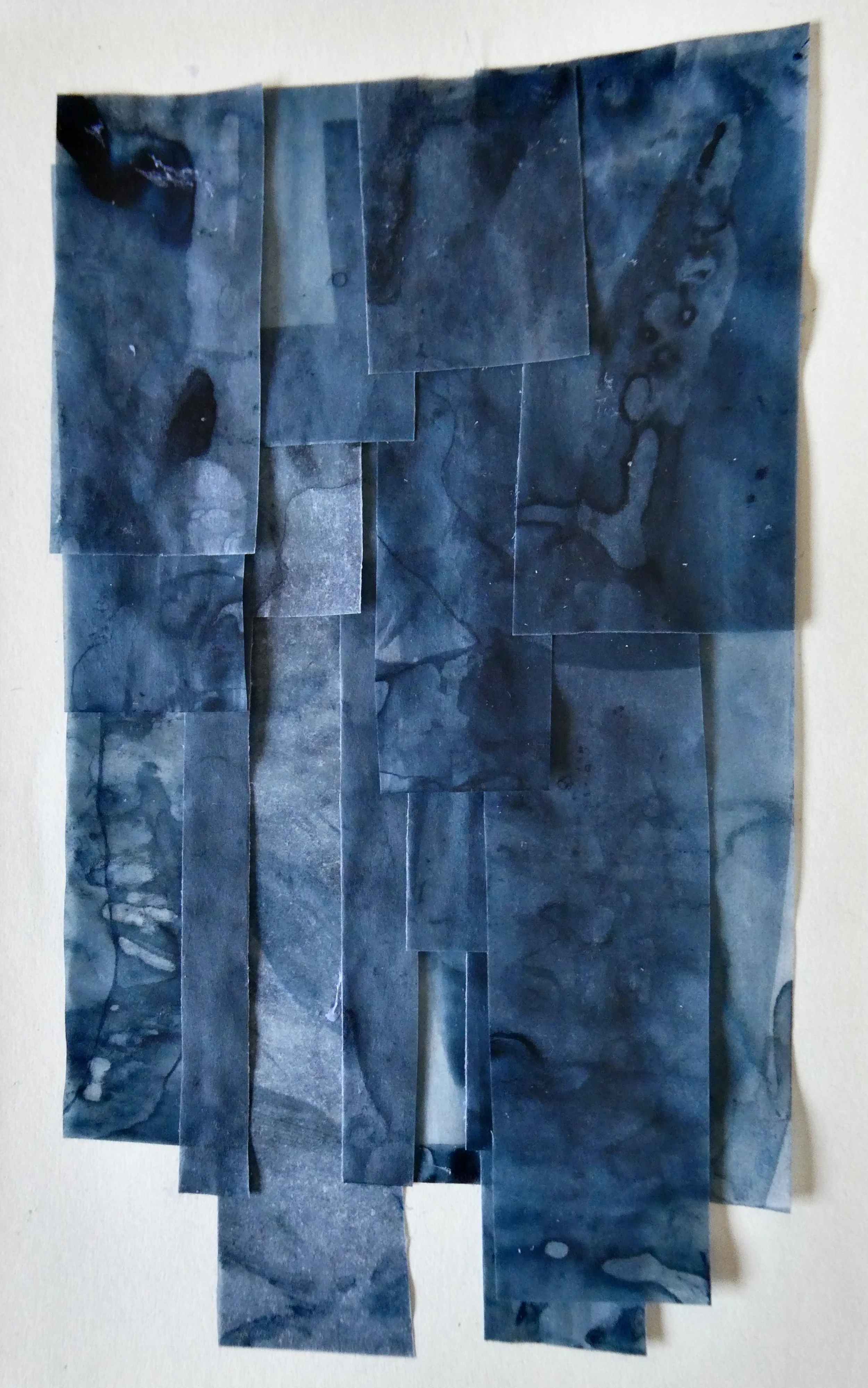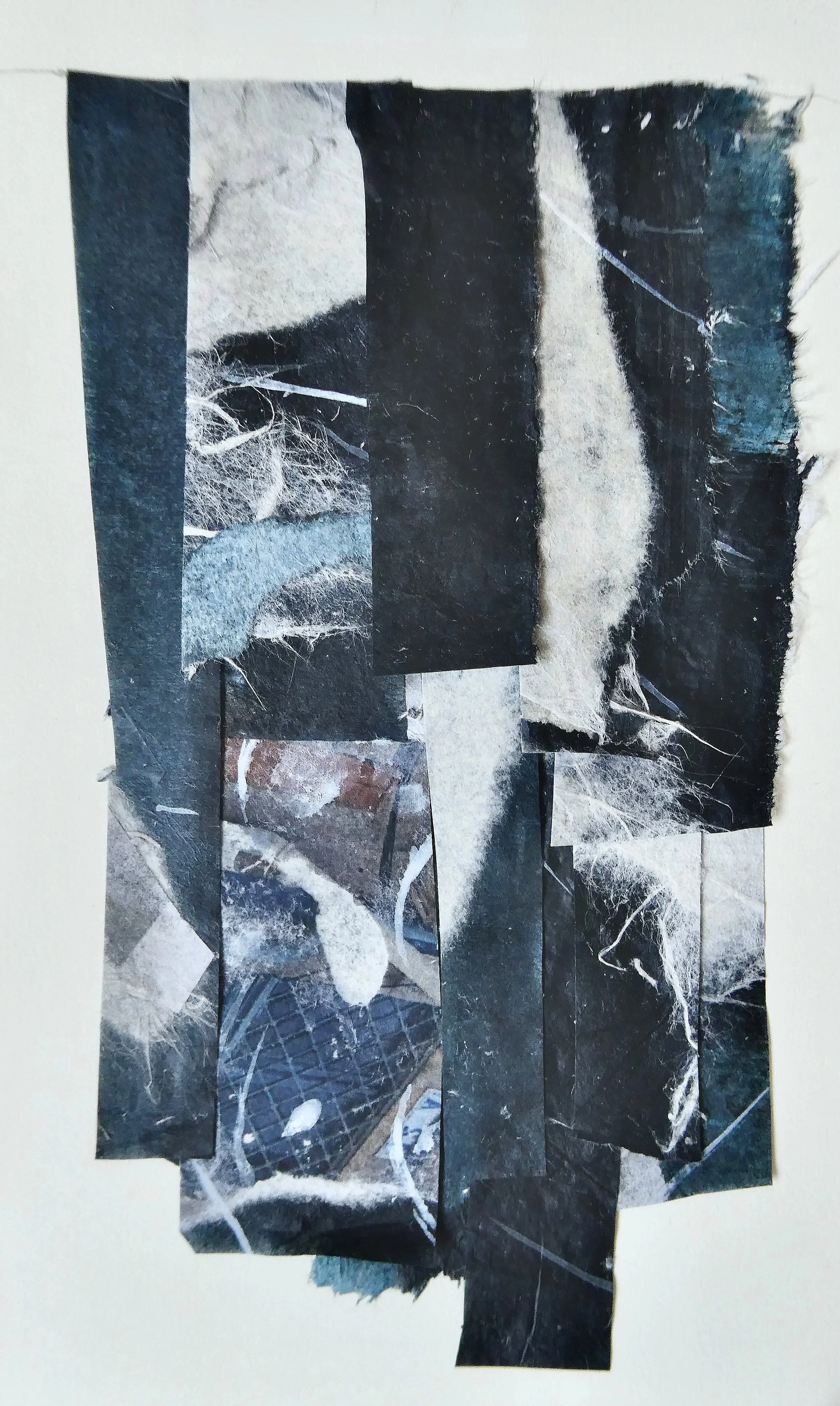 2025 - Remnant collages - small working images of that may result in larger work. No image is bigger than cupped hands. Most will fit in the palm of one hand. Recycled, found, salvaged papers from Japan, Europe, and North America, color as paint or ink.