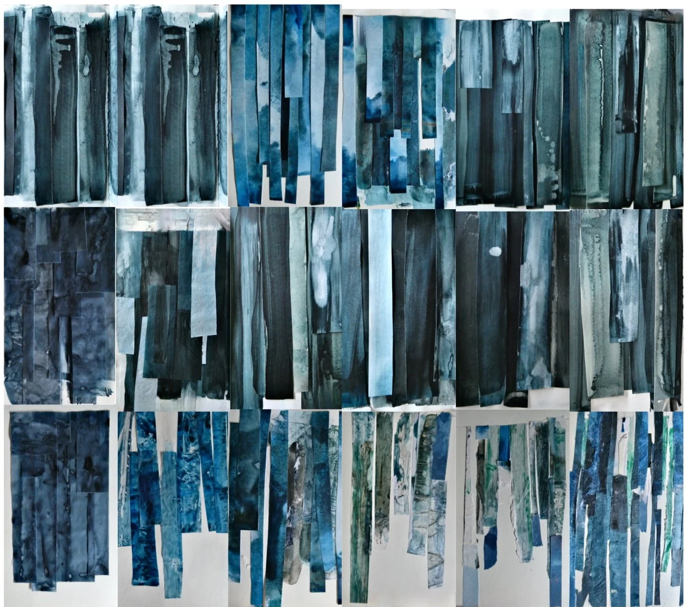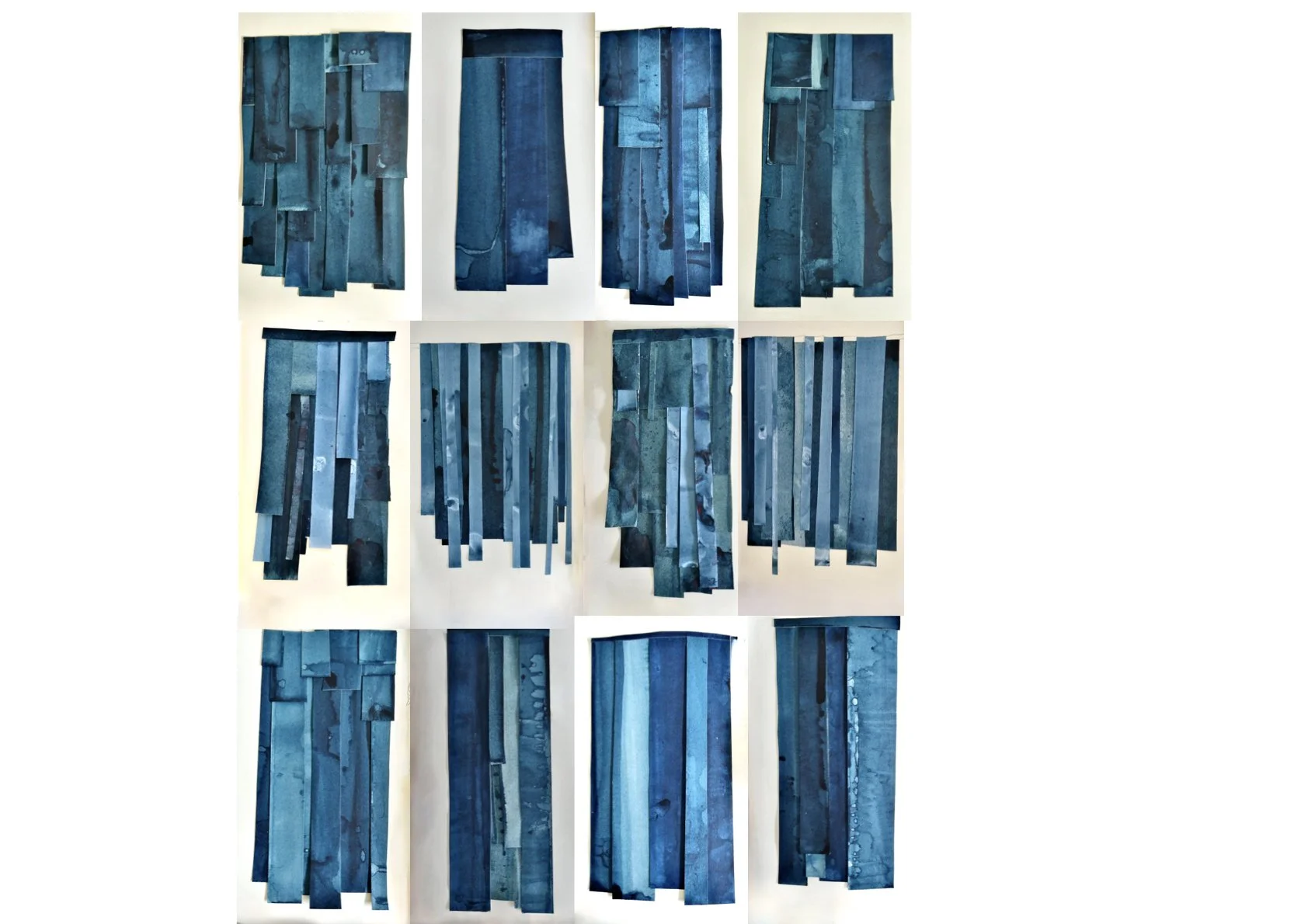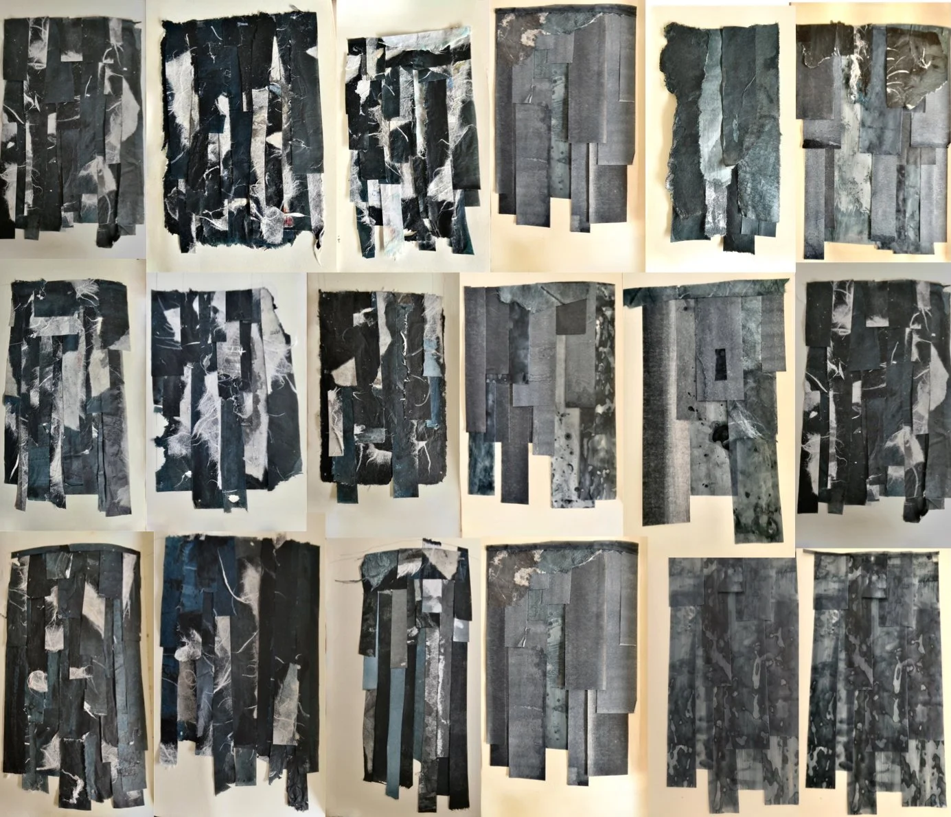 2025 - Remnant collages - small working images of that may result in larger work. No image is bigger than cupped hands. Most will fit in the palm of one hand. Recycled, found, salvaged papers from Japan, Europe, and North America, color as paint or ink.