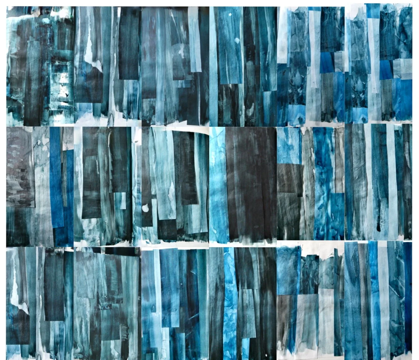 My paintings are inspired by Eadweard Muybridge’s waterfalls, night water photos, my direct experiences with rapids, spills, sluices, waterfalls, overflow from gutters and downspouts. I study Japanese mended textiles, paper remnants and degraded waste, especially that found near and in waterways. Recent paintings are site-specific, expansive, or conversely quite small, intimate in scale. Paintings may be hung against a wall or suspended as a curtain, double-sided. Small collages can be held. I think in multiples, splits, episodically. Through water/landscape numerations, I imagine a "though" and "perhaps" conversation with with color, materials, and specific watery places.